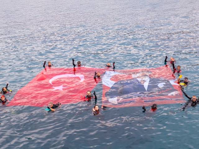Etkinliğimiz, Alanya’nın en özel noktalarından biri olan Tersane önünde gerçekleştirildi. 20 gönüllü dalgıcımız, deniz dibinde biriken atıkları temizlerken; aynı zamanda dalış esnasında şanlı bayrağımızı ve ulu önder Atatürk’ün büyük boy posterlerini deniz altında açarak anlamlı bir mesaj verdiler.