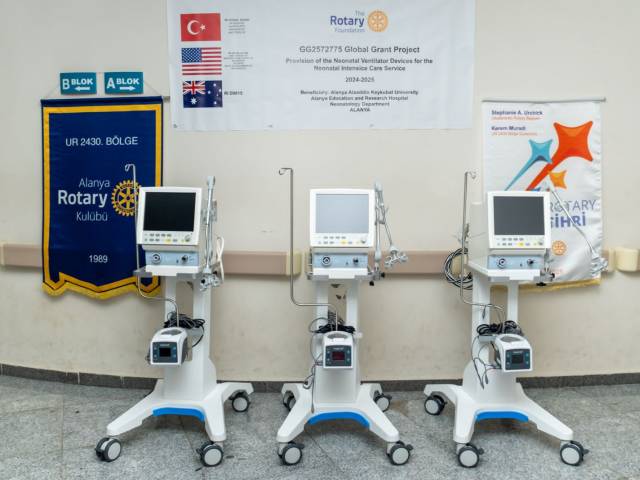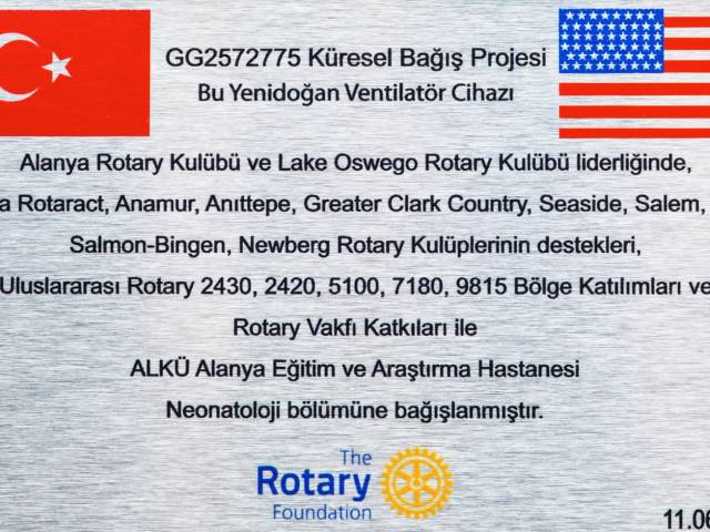 Alanya Rotary Kulübü olarak, uluslararası iş birliğiyle anlamlı bir sağlık projesini daha hayata geçirdik. Küresel Bağış Projesi kapsamında, Lake Oswego Rotary Kulübü (ABD) ve Anamur, Anıttepe, Alanya Rotaract, Greater Clark County, Seaside, Salem, White Salmon-Bingen, Newberg gibi birçok yerel ve uluslararası Rotary kulübünün desteğiyle temin edilen 3 adet Yenidoğan Ventilatör Cihazı, ALKÜ Alanya Eğitim ve Araştırma Hastanesi Neonatoloji Bölümü’ne bağışlandı.